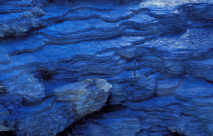 Terrassenförmig erstarrtes Eis in einem gefrorenen Bachlauf (Val Curciusa).